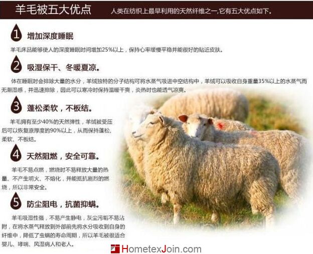 羊毛被具有天然抗菌性,永久的彈性,絕佳的保暖性和超強的吸、放濕功能;與化纖太空被相比,羊毛纖維的主要成分角朊蛋白質與人體皮膚外表起保護作用的蛋白質相同,使它具有天然的親膚性,可保持貼近皮膚的最佳睡眠溫度32.7℃,增加深度睡眠時間;羊毛的天然抗菌性可以有效抑制霉菌、螨蟲的生長。羊毛擁有至少40%的天然彈性,羊毛被受壓后可以恢復原厚度的90%以上,從而長期保持彈性、柔軟,不會板結。